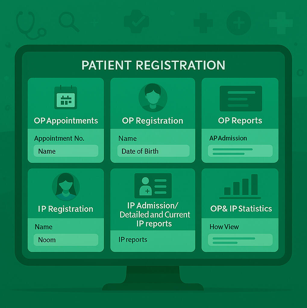 The system enables creating OP appointments by entering basic patient details. Complete patient information can be recorded during OP and IP registration. Patient details can be viewed through OP reports, while IP admission, detailed, and current reports provide comprehensive inpatient information. OP and IP statistics reports help track and analyze outpatient and inpatient data effectively.