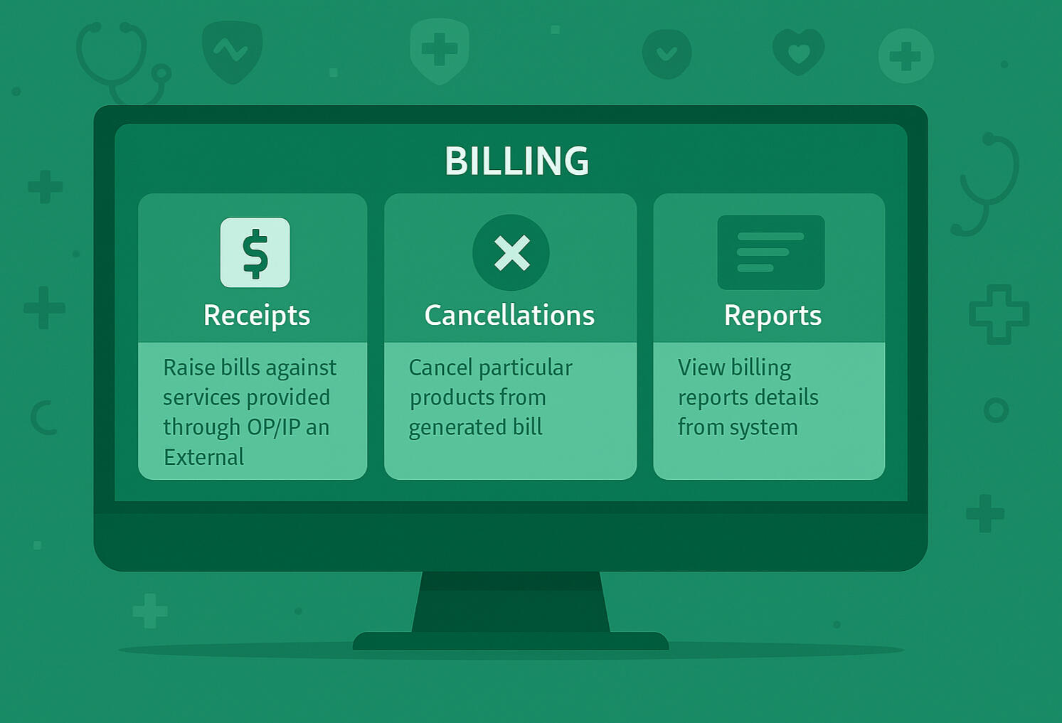 The system allows generating bills for services and treatments provided to OP, IP, and external patients. It also enables cancellation of specific items from generated bills. Billing reports can be viewed to monitor and review financial transactions.