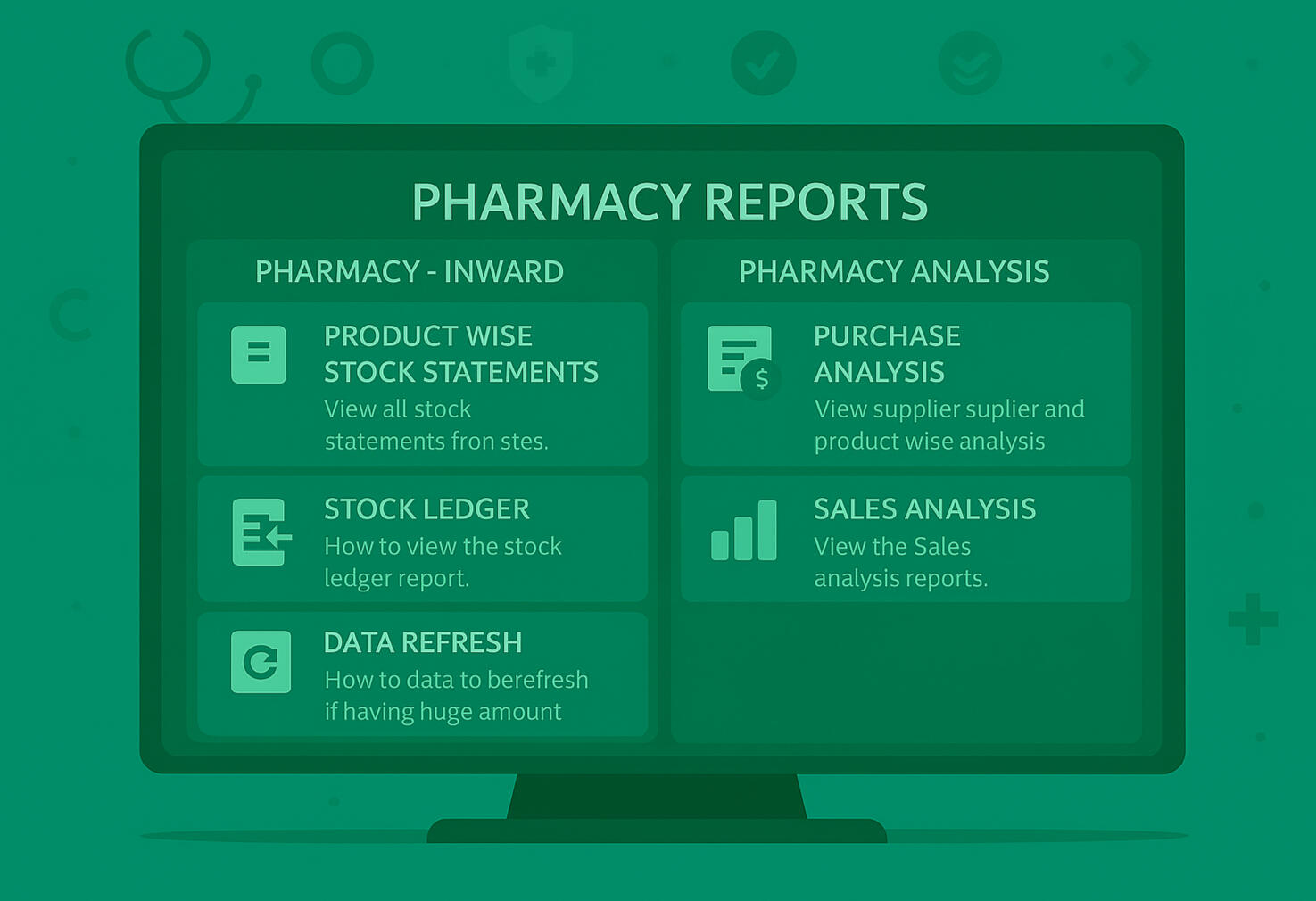 The system provides pharmacy reports including product-wise stock statements and stock ledger for detailed tracking. A data refresh option is available for handling large volumes of data. Pharmacy analysis features include viewing supplier and product-wise purchase analysis and sales analysis reports for better inventory and sales management.