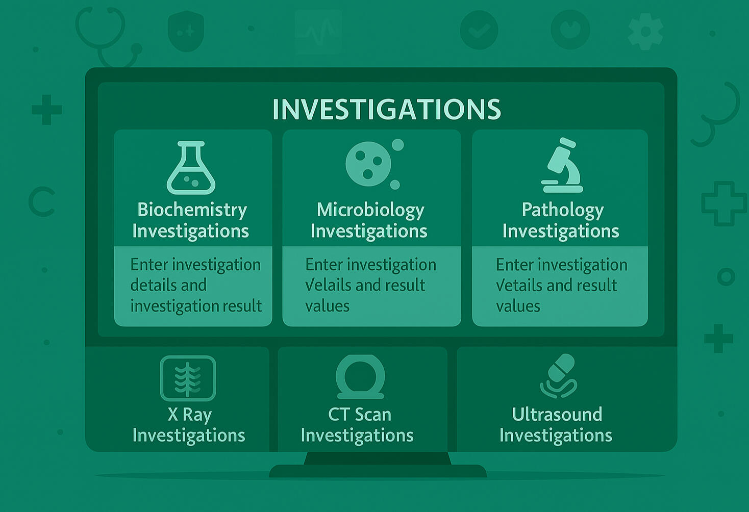 The system allows entry of investigation details and result values for various diagnostic departments, including Biochemistry, Microbiology, Pathology, X-Ray, CT Scan, and Ultrasound, ensuring accurate and organized patient test records.